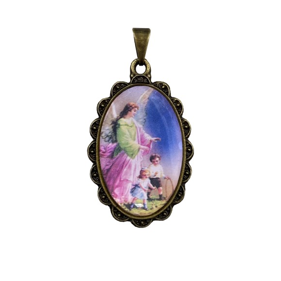 MD128910 - Medalha Anjo da Guarda Rendada Ouro Velho - 4,2x2,5cm