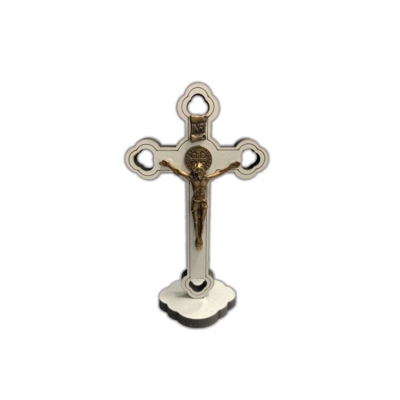 *Crucifixo de Mesa São Bento Madeira Branco - 12x7cm.