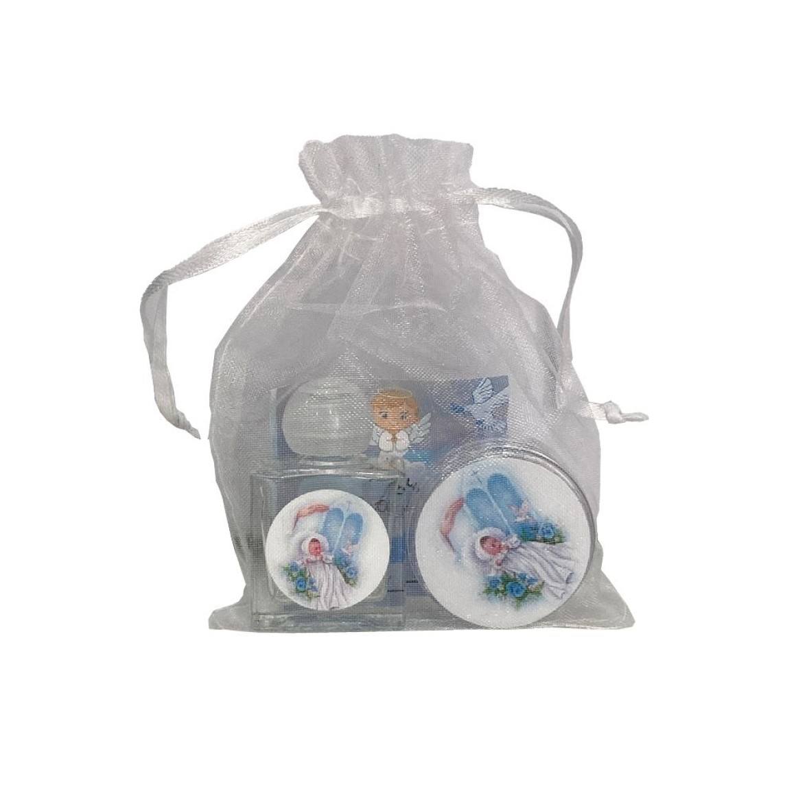 *Kit Batismo Menino c/ Caixinha de Acrílico, Dezena e Garrafa de Água Benta - 10ml.