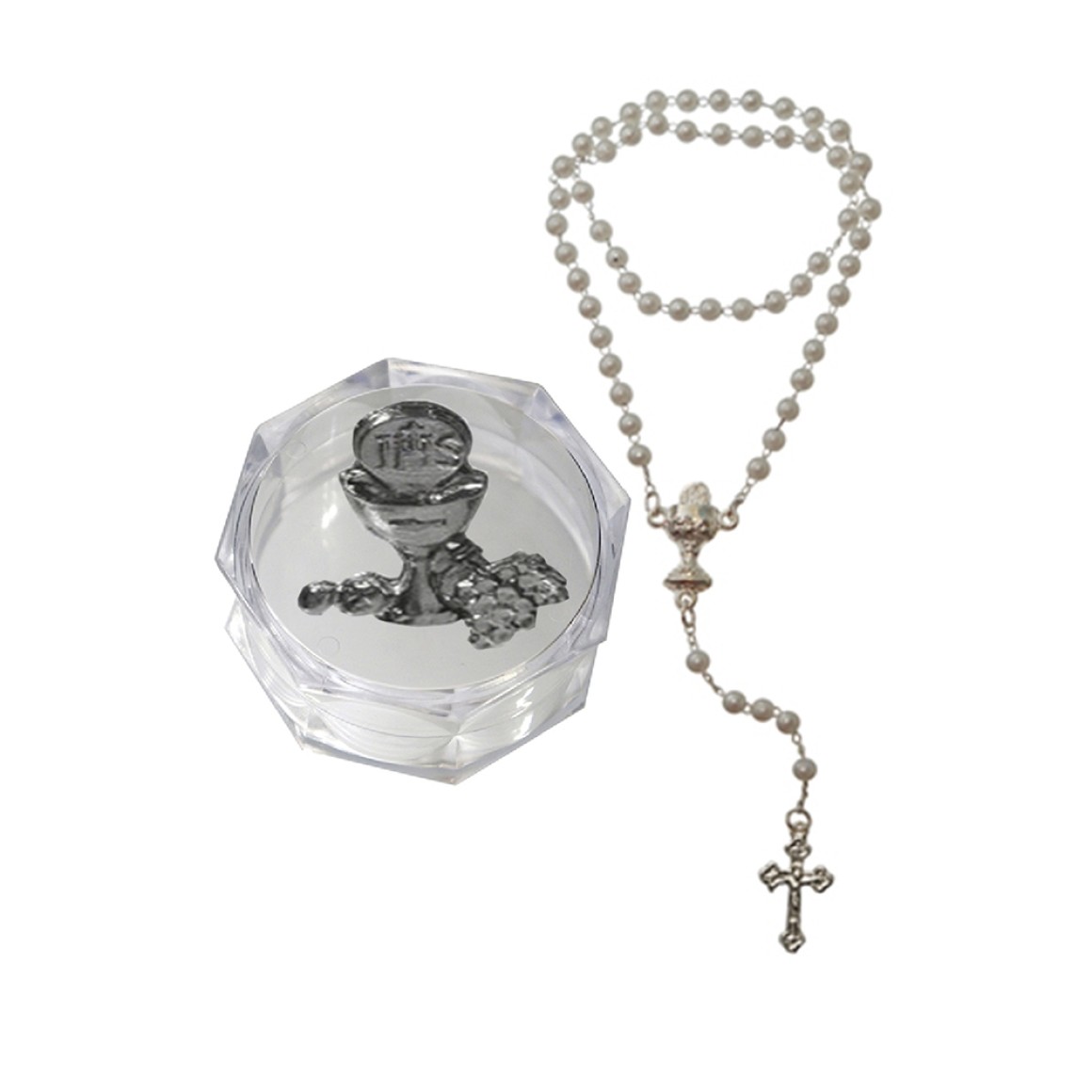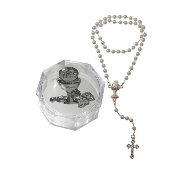 - TE112014 - Caixa de Acrílico Sextavada c/ Medalha e Terço de Pérola n°4 Primeira Eucaristia - 3,5X3,5cm