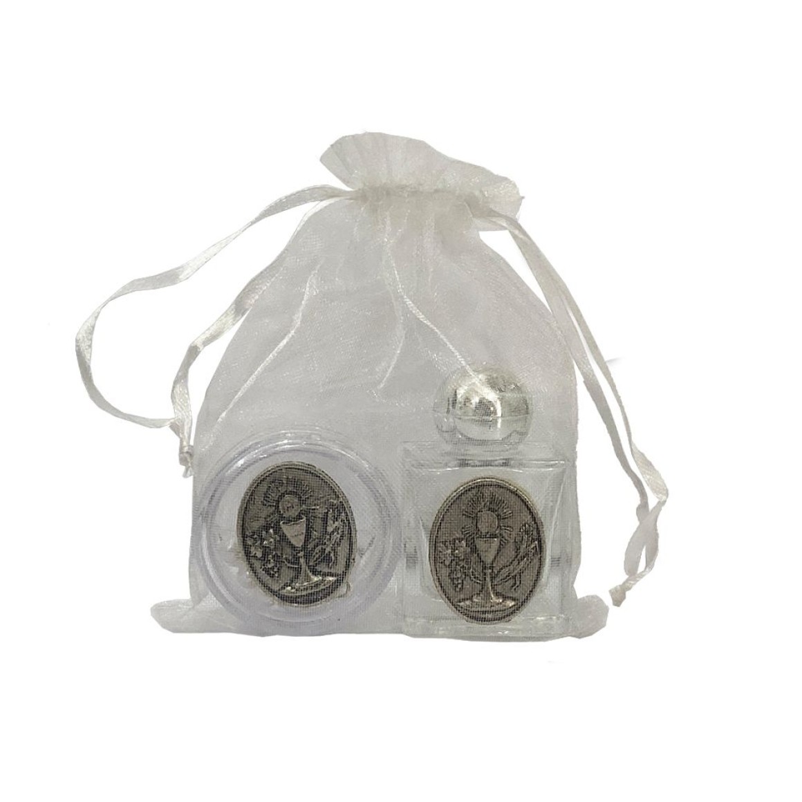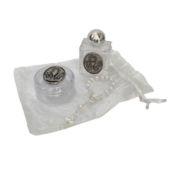 KT112275 - Kit Primeira Eucaristia c/ Caixinha de Acrílico, Dezena e Garrafa de Água Benta - 10ml
