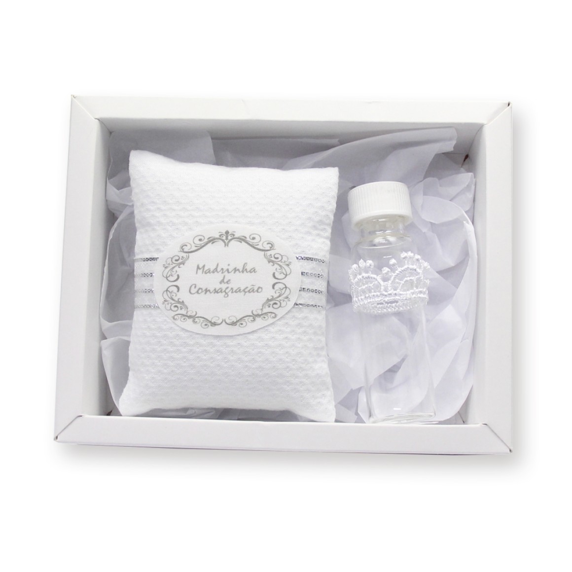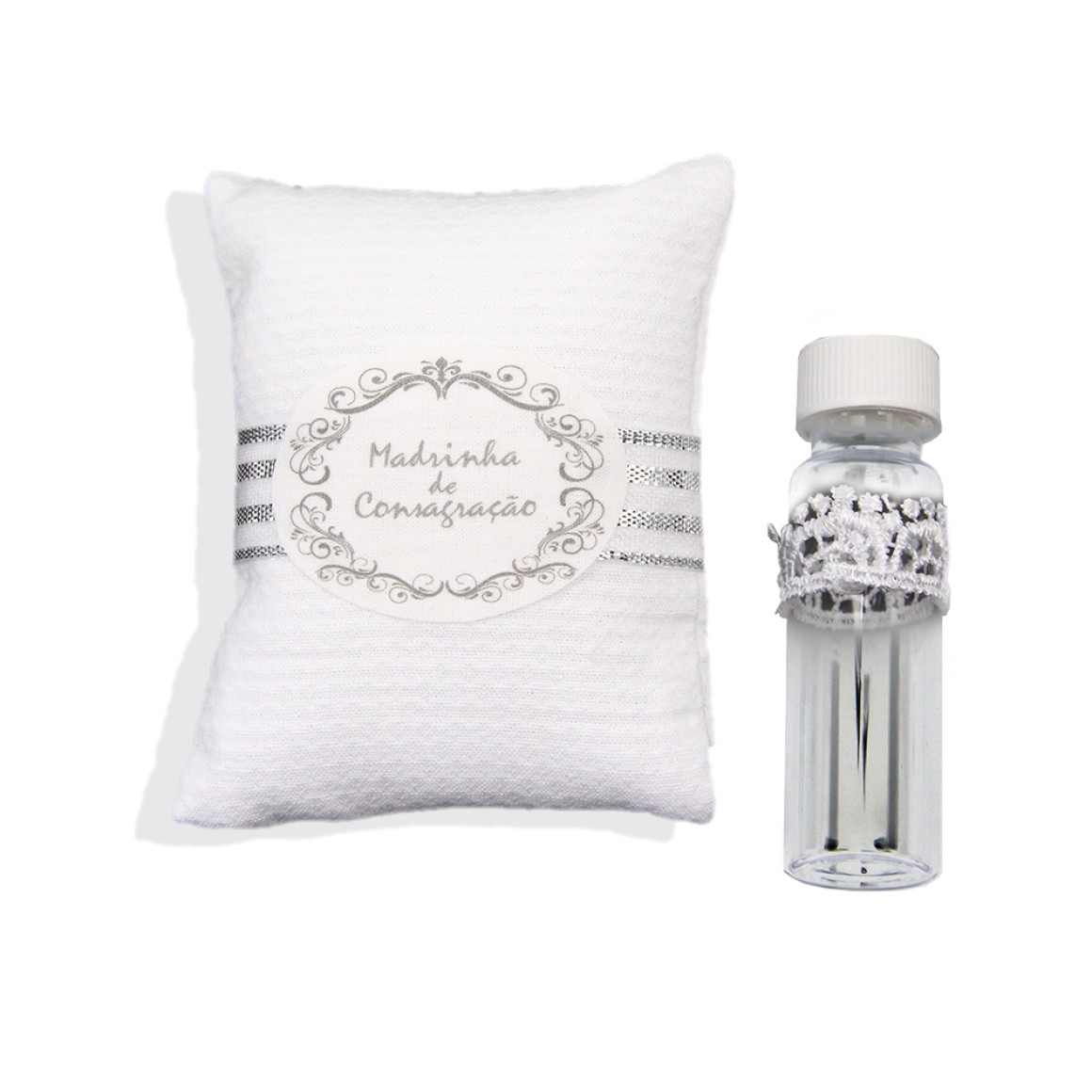 *Kit Batismo Madrinha de Consagração c/ Almofada e Vidrinho p/ Água Benta - 11x14cm.