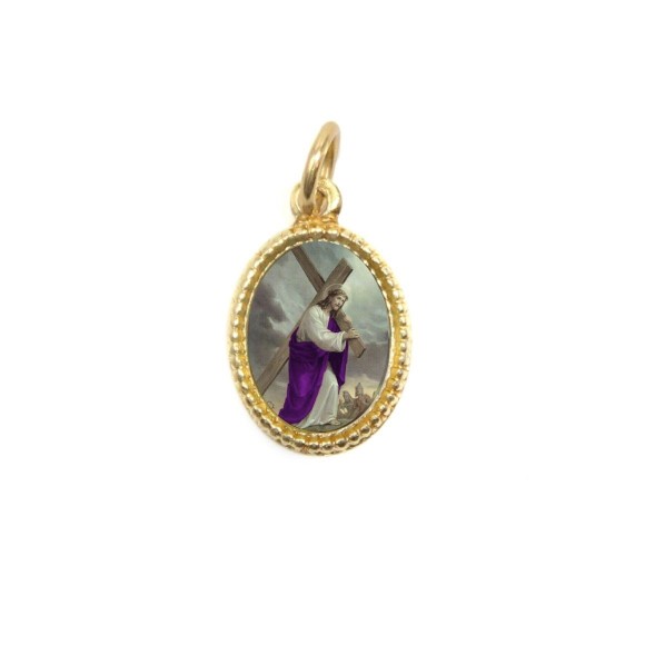 MD102277P20 - Medalha de Alumínio Oval Pequena Dourada c/ 20un. Bom Jesus dos Passos - 1,5x1cm