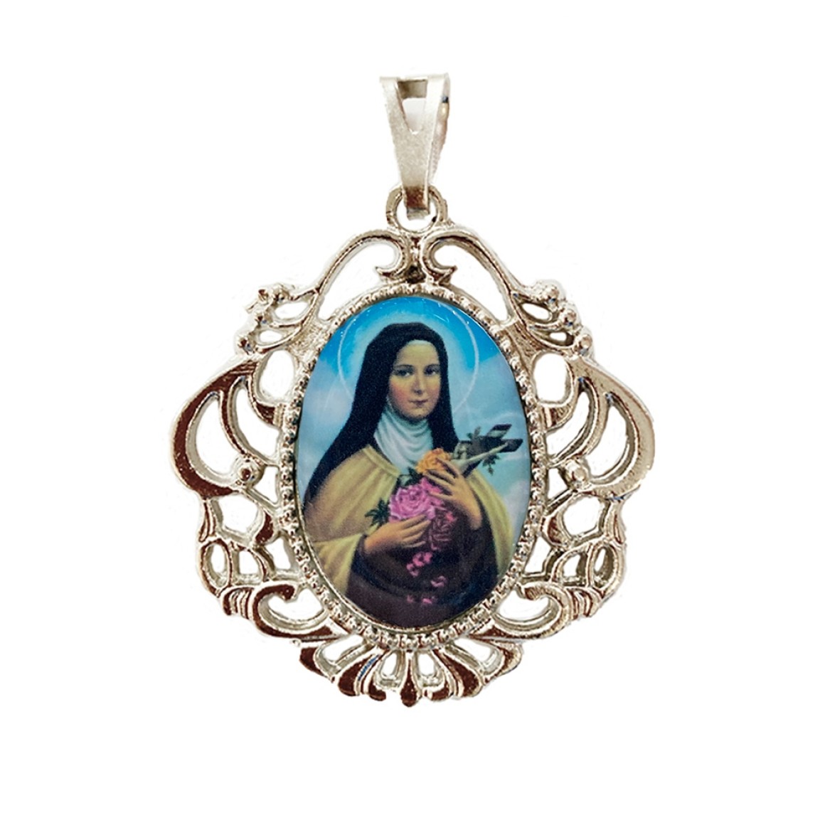 MD129076 - Medalha Santa Terezinha das Rosas Camafeu Níquel - 4,5x4cm